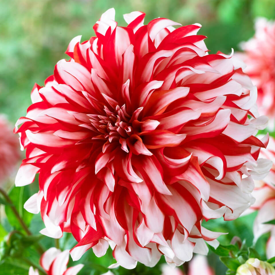 The Dahlia ‘Santa Claus’ is a dramatic bi-colour Dinner Plate dahlia, famous for its large red-and-white striped blooms. Each flower can reach up to about 25 cm (10 inches) in diameter, giving a festive, eye-catching look that also makes it a popular choice for cut arrangements.